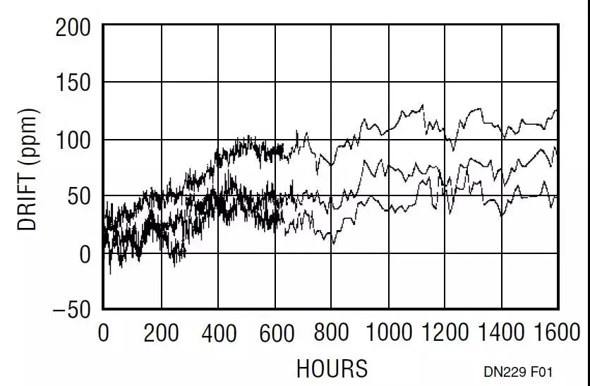 最初每小时读取一次数据,这时发 生的变化最大;但几百个小时之后,频率降低以减少众多的数据点。图3示出了一个竞争基准的长期漂移,其数据表中格定的长期漂移为0.2ppm/kHr。测量数据显示该基准具有60ppm/kHr和150ppm/kHr之间的漂移,也就是说,比它声称的规格差了 300至750倍。