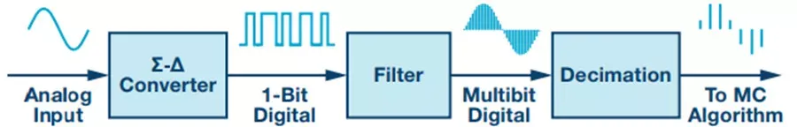 Σ-Δ ADC具有最低的分辨率(1位),但通过过采样、噪声整形、数字滤波和抽取,可以实现非常高的信号质量。Σ-Δ ADC和sinc滤波器的原理已广为人知且有据可查,本文不予讨论。本文关注的是如何在电机驱动中实现最佳性能,以及如何在控制算法中利用该性能。