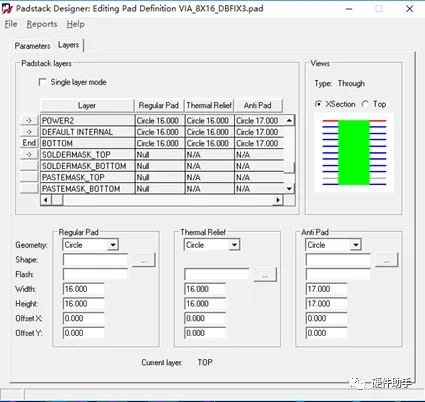 常规过孔所有层的RegularPad尺寸都一样,没有SolderMask层和PasteMask层,因为过孔都上绿油了。