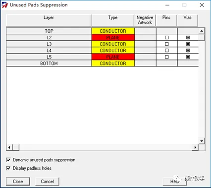 菜单setup→UnusedPads Suppression,在Vias列中选中对应的层即可,若是通孔则选择Pins。
