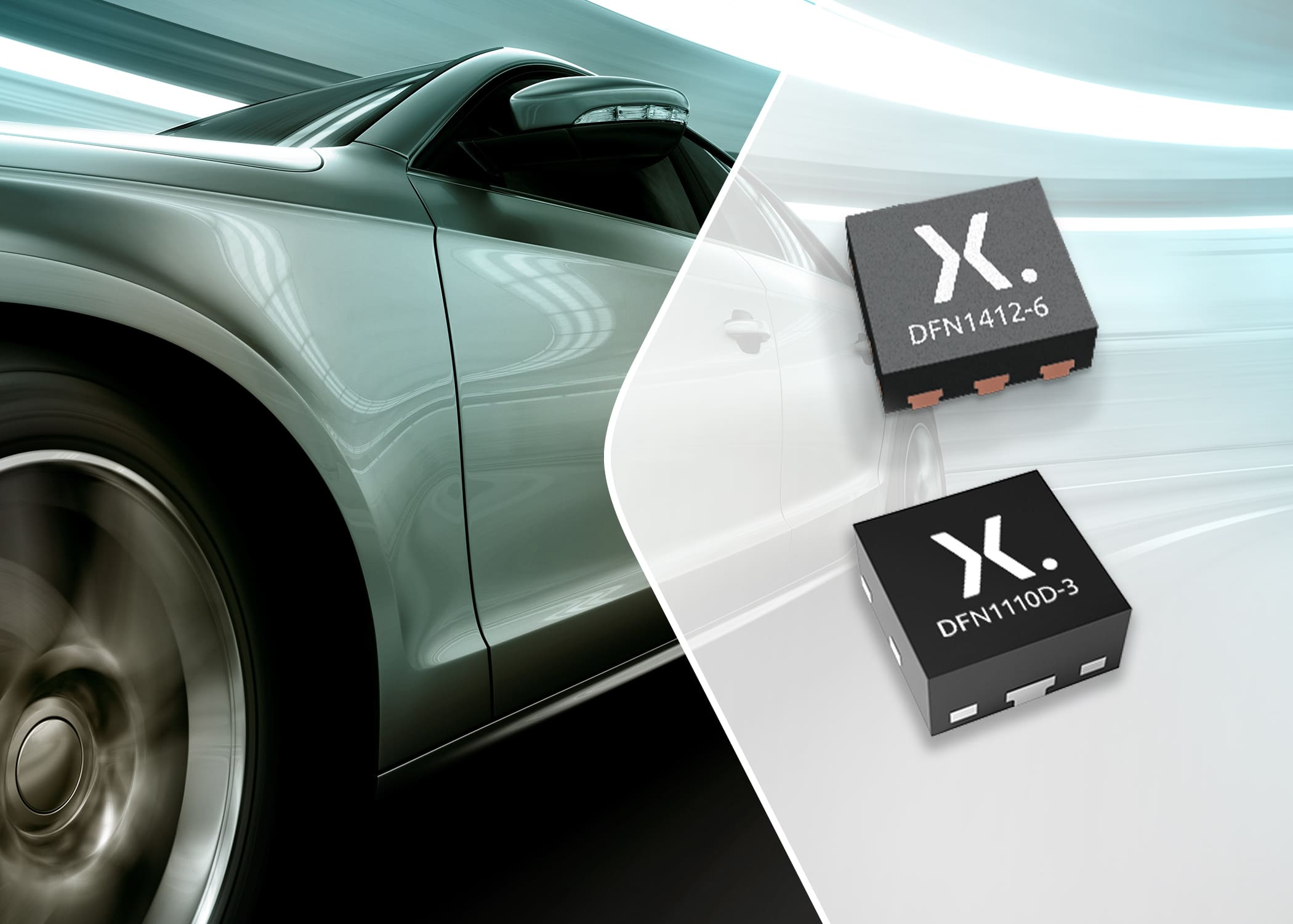 DFN1110D-3和DFN1412-6属于无引脚封装,具有出色的热性能,从结到环境的热阻(Rthj-s )降低了近50%,并采用超小的封装尺寸(可缩小高达80%的布局空间)。这使得它们成为现有的有引脚外壳(例如SOT23、SOT323、SOT363或SOT666)的极具吸引力的替代品,从而满足了汽车行业对小型化器件的持续需求。DFN1110-D-3还具有侧边可湿焊盘,以支持对焊点进行低成本自动光学检测(AOI),这也有助于提高可靠性。
