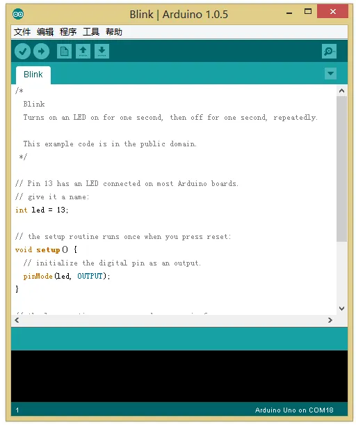 下载一个最简单的代码,既可以帮你熟悉如何下载程序,同时也测试下板子好坏。UNO板上标有L的LED。这段测试代码就是让这个LED灯闪烁。