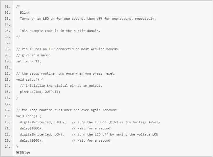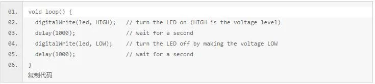 在这个程序里有两个函数,一个叫做setup,它的目的主要的loop函数运行之前为程序做必要的设置。在Arduino中程序运行时将首先调用 setup() 函数。每次 Arduino 上电或重启后,setup 函数只运行一次。