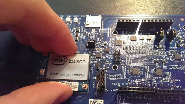 2. 将英特尔® Edison核心板安装在Edison扩展板白色轮廓指定的区域。