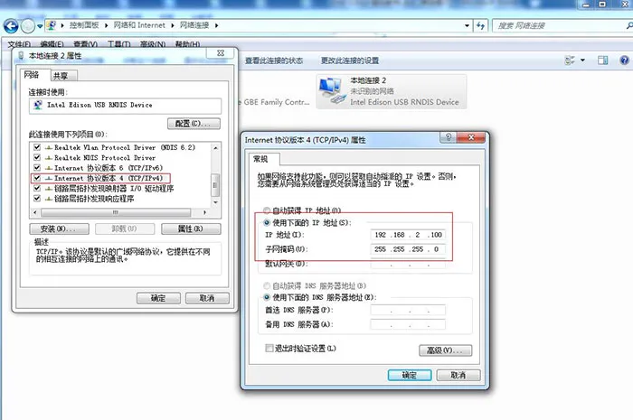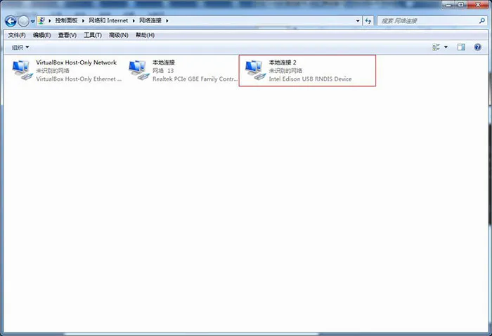 1. 连接 Edison,安装驱动完成后,在网络连接里可看到新加入的 “Intel Edison USB RNDIS” 网卡设备。