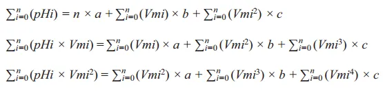 若有多组点,为提高精度,可使用一阶线性回归。给定n个数据点P0 (Vm0, pH0)、P1 (Vm1, pH1)、P2 (Vm2, pH2)、P3 (Vm3, pH3)、…、Pn (Vmn, pHn),可以利用最小二乘法建立一般方程pHx = a + b ×Vmx,其中b为直线的斜率,a为截距,其值如下: