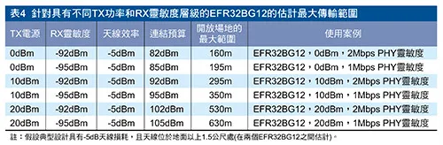 使用编码的PHY可改善RX灵敏度,这也意味着传输范围的提升。通常,使用500kbps或125kbps PHY可达到4~6dB的RX灵敏度改善,且这通常将会产生二至四倍的传输范围改善。当然,LE编码PHY的缺点是TX和RX时间将会更长,进而导致平均功耗增加。表2是LE编码PHY关键参数的总结。