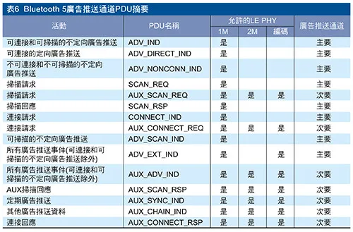 Bluetooth 5对于此项限制已做出重大的变更。首先,三个广告通道将维持与Bluetooth 4完全相同,以提供向后兼容性和互操作性,但现在称为主要广告通道。除了三个主要广告信道外,Bluetooth 5装置可以使用其余的三十七个数据信道中的任何一个作为次要广告信道来播放更多数据并分担主要信道的负载。表5为Bluetooth 4和Bluetooth 5广告推送通道方案之间的差异总结。