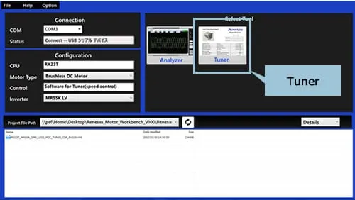 接下来,进行无传感器矢量控制。同刚才的120度通电控制一样,需要将程序写入装载了RX23T的CPU卡内。无传感器矢量控制的程序公开了2种类型,一种是,一旦写入马上能够进行电机控制的网络公开程序。另一种是在下载了Renesas Motor Workbench的文件夹中,带有Tuner功能的无传感器矢量控制程序。Tuner功能是指能够自动调整矢量控制中所需的电机参数及控制参数的功能。本来,进行矢量控制需要正确设置非常多的参数,但通过利用此Tuner功能,可以将麻烦的参数调整简单化。由于网上公开的程序是已经调整过与所附带的电机相配的参数的程序,所以不需要自动调整。