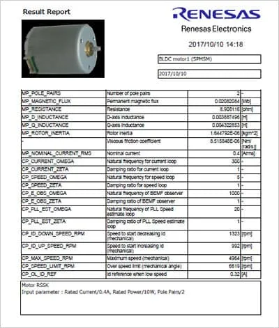按照使用说明书,尝试使用Tuner功能。进行自动调整后,30秒左右就能完成数据调整。根据Tuner功能,可以将调整后的结果输出为可用于瑞萨电子的矢量控制程序的定义文件,或输出为如图5所示PDF文件的报告。不需要多次调整同一电机,还可以简单地积累调整结果,非常便利。
