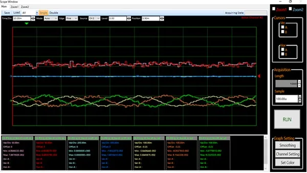 Analyzer功能的最大特点是能在电机转动的同时不停止CPU,持续读写微控制器内部的变量,并用波形显示。若停止CPU,则可能由于PWM的输出状况而导致电流过大,损坏逆变板。因此,它在电机控制领域中,不像其他应用程序一样在程序中设置暂停,导致无法确认微控制器内部的变量。所以这是一项非常有效的功能。另外,由于电机控制,尤其是矢量控制中,使用了被称为“d轴”、“q轴”的电流值等在微控制器内部演算的电流值,因此在一般的示波器中无法确认数值。