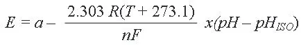 方程表明,产生的电压取决于溶液的酸度和碱度,并以已知方式 随氢离子活性而变化。溶液温度的变化会改变其氢离子的活性。 当溶液被加热时,氢离子运动速度加快,结果导致两个电极间电 位差的增加。另外,当溶液冷却时,氢活性降低,导致电位差下 降。根据设计,在理想情况下,当置于pH值为7的缓冲溶液中时, 电极会产生零伏特电位。