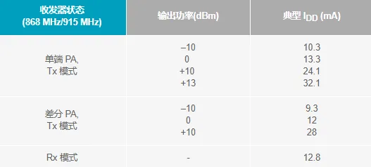 收发器功耗对电池供电应用非常重要。这在许多无线应用中也是 一个考虑因素,因为它决定了数据速率和距离范围。收发器有两 个功率放大器(PA)选项以提供更大的使用灵活性。单端PA可以输 出最多13 dBm的RF功率,差分PA可以输出最多10 dBm的功率。表 4总结了一些PA输出功率与收发器IDD电流消耗的关系。为完整起 见,表中同时给出了接收模式的电流消耗。