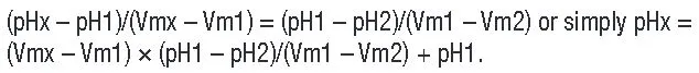 可利用多个数学方程导出校准方程。常用公式之一是点斜式直线 方程。此方程使用校准期间获得的两点:P1 (Vm1, pH1)和P2 (Vm2, pH2),其中P1和P2是利用所选缓冲溶液测得的点。为了确定未知 溶液的pH值,对于给定点Px (Vmx, pHx),可以利用方程进行简单的 线性插值: