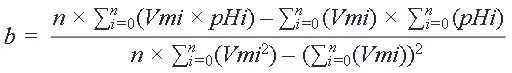 若有多组点,为提高精度,可使用一阶线性回归。给定n个数据 P0 (Vm0, pH0), P1 (Vm1, pH1), P2 (Vm2, pH2), P3 (Vm3, pH3), ... , Pn (Vmn, pHn), 可以利用最小二乘法建立一般方程, pHx = a + b × Vmx, 其中b为直线的斜率,a为截距,其值如下: