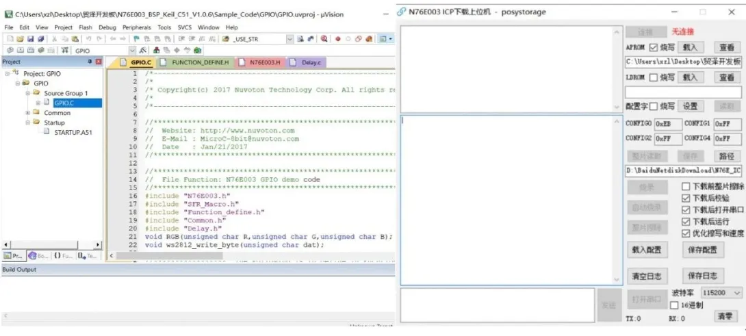 从机使用keil C51作为开发软件。这里提供一款非常好用的小工具,由开发者制作的ICP烧录器,专门针对N76E003这款MCU而优化的的编程器,具有硬件小巧,性价比高的优势。
