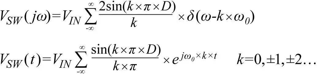 图1所示为典型的降压稳压器。两个开关交替接通和断开,因此SW节点电压VSW是一个理想的方波,此特性进而传递到占空比和输入电压。VSW可以用下面的公式表示: