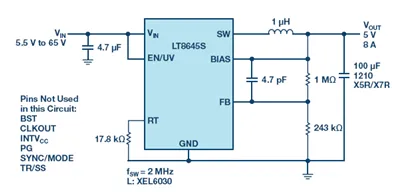 <p><em>图1.提供5 V、8 A、2 MHz输出的LT8645S原理图</em></p>