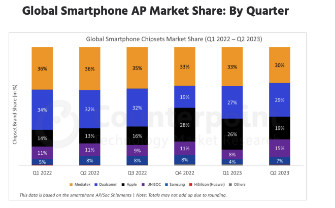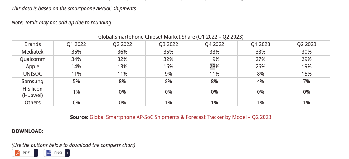 3、2023 年第二季度,三星的出货量有所增加。Exynos 1330 和 1380 的推出增加了中低端和中高端市场的出货量。