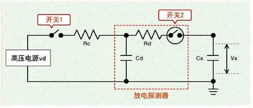 (ii)开关1断开,开关2闭合,对测试对象电容器(Cx)施加Cd存储的电量,进行测试。