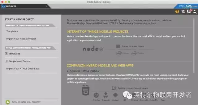 打开英特尔XDK物联网平台,选择“导入Node.js项目”。