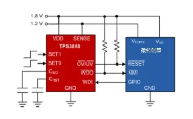 ---使用具有看门狗定时器的电压监控器。像是TPS3851或TPS3110具有看门狗定时器功能的监控器能够以外部冗余方式监控电源电压和看门狗讯号。若处理器的内部看门狗未能侦测到错误或缺失的脉冲,外部看门狗定时器将能发挥其他方式无法达到的侦测层级。