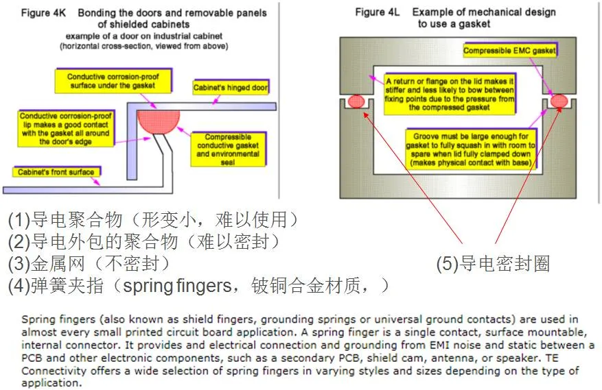 要达到40dB的SE,通常需要用导体垫圈、弹簧夹指来进行密封,注意内部元件与屏蔽罩的间距、数据总线与开孔和缝隙之间的距离。