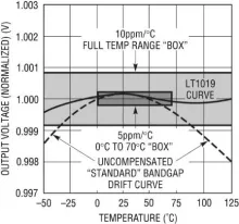 温度漂移也许是评估电压基准性能时使用最为广泛的性能规格,因为温度漂移显示输出电压随温度的变化。温度漂移由电路组件的瑕疵和非线性引起。很多器件的温度漂移都以 ppm/°C 为单位规定,是主要的误差源。器件的温度漂移如果是一致的,就可以进行一定程度的校准。