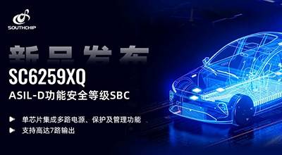 9 月 22 日,南芯科技(证券代码:688484)推出全新 ASIL-D 功能安全等级的车规级 SBC SC6259XQ,可应用于 12V 和 24V 系统,单芯片集成多达 7 路电源,具备完善的输出保护机制及看门狗和 FCCU 功能。
